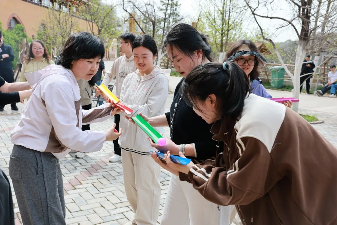 “珠行万里”考验团队协作,五人一组,手持U型槽,首尾衔接,将小球平稳运送至终点。稍有偏差,小球便可能落地,考验的是耐心、细心与配合。“不倒森林” 则要求五人同步移动,手扶塑料杆,围成圆圈,听令后迅速扶住前方队友的杆,杆不倒、人不乱,展现出高度的团队默契。